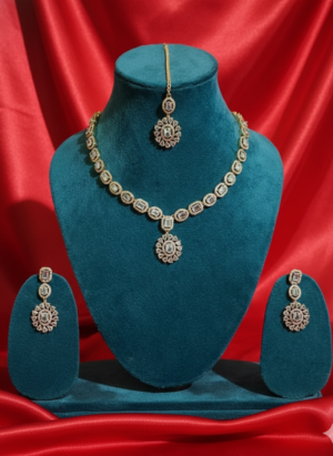 ₹399.00Current price is: ₹399.00.Royal American Diamond Necklace Set with Earrings & Maang Tikka
