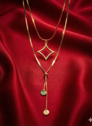 ₹1,299.00Current price is: ₹1,299.00.Elegant Dual-Layer Gold Geometric Drop Necklace