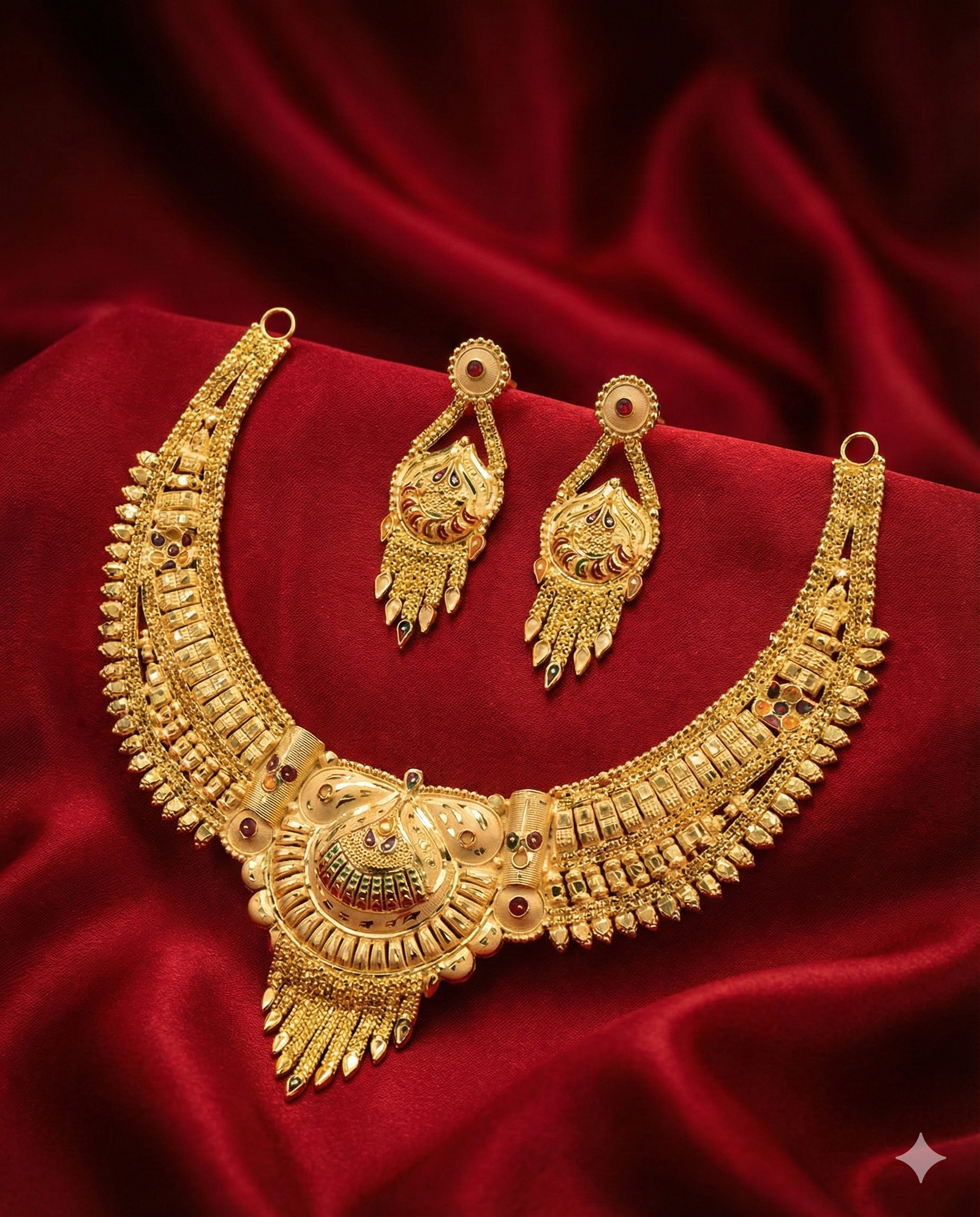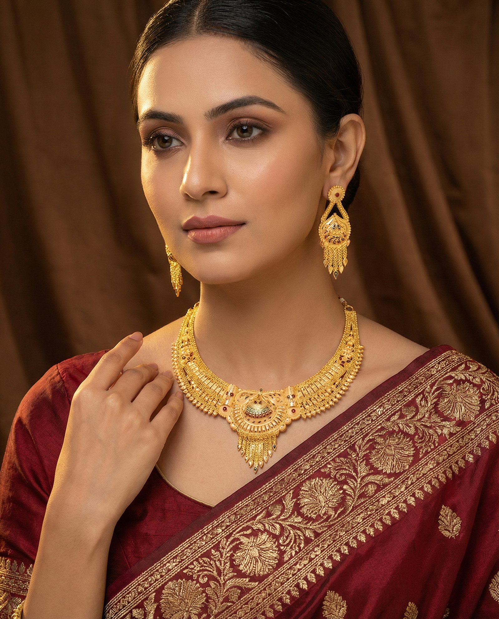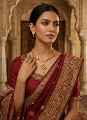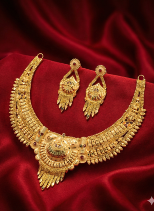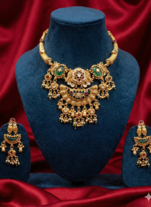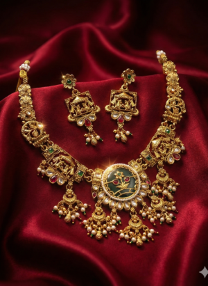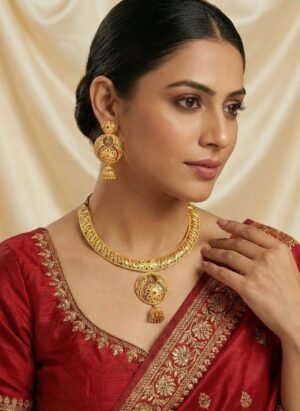 ₹1,199.00Current price is: ₹1,199.00.Royal Temple-Inspired Antique Gold Bridal Necklace Set