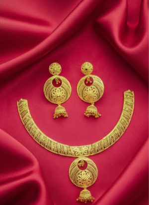 ₹1,299.00Current price is: ₹1,299.00.Classic Antique Gold Filigree Necklace Set with Jhumka Earrings