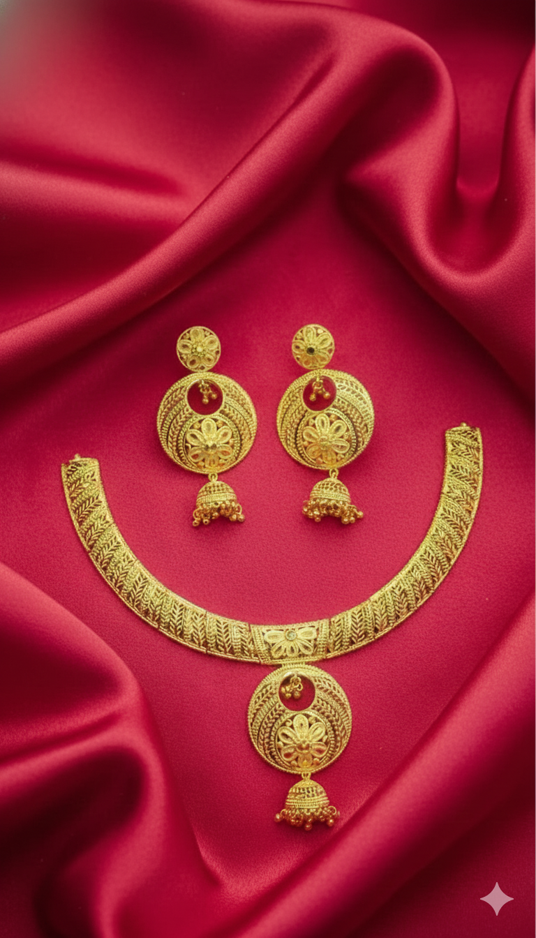 ₹849.00Current price is: ₹849.00.Classic Antique Gold Filigree Necklace Set with Jhumka Earrings