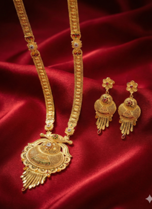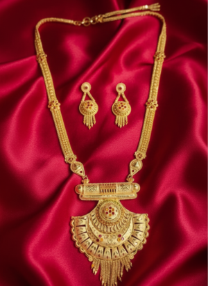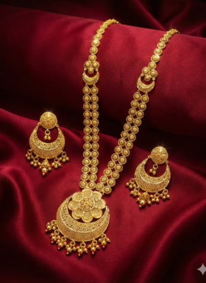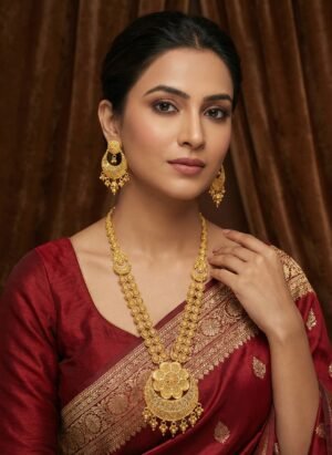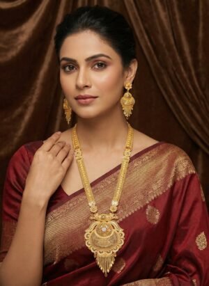 ₹999.00Current price is: ₹999.00.Traditional Gold-Finish Long Necklace Set with Matching Jhumka Earrings