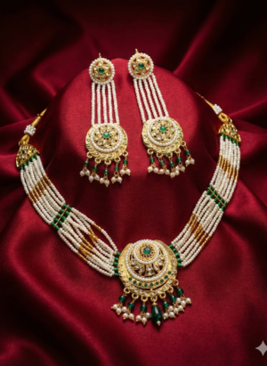 ₹1,999.00Current price is: ₹1,999.00.Traditional Pearl & Kundan Bridal Necklace Set with Long Earrings