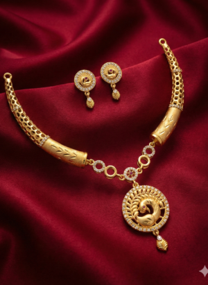 ₹1,299.00Current price is: ₹1,299.00.Traditional Gold-Finish Peacock Pendant Necklace Set with Stud Earrings
