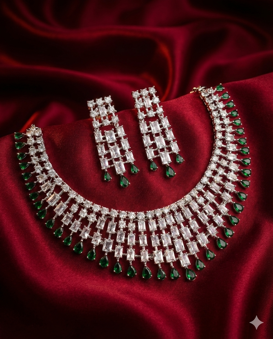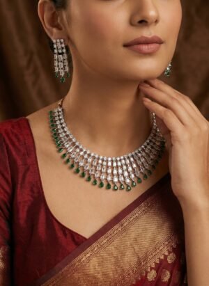 ₹1,299.00Current price is: ₹1,299.00.Emerald Green American Diamond Choker Necklace Set with Earrings