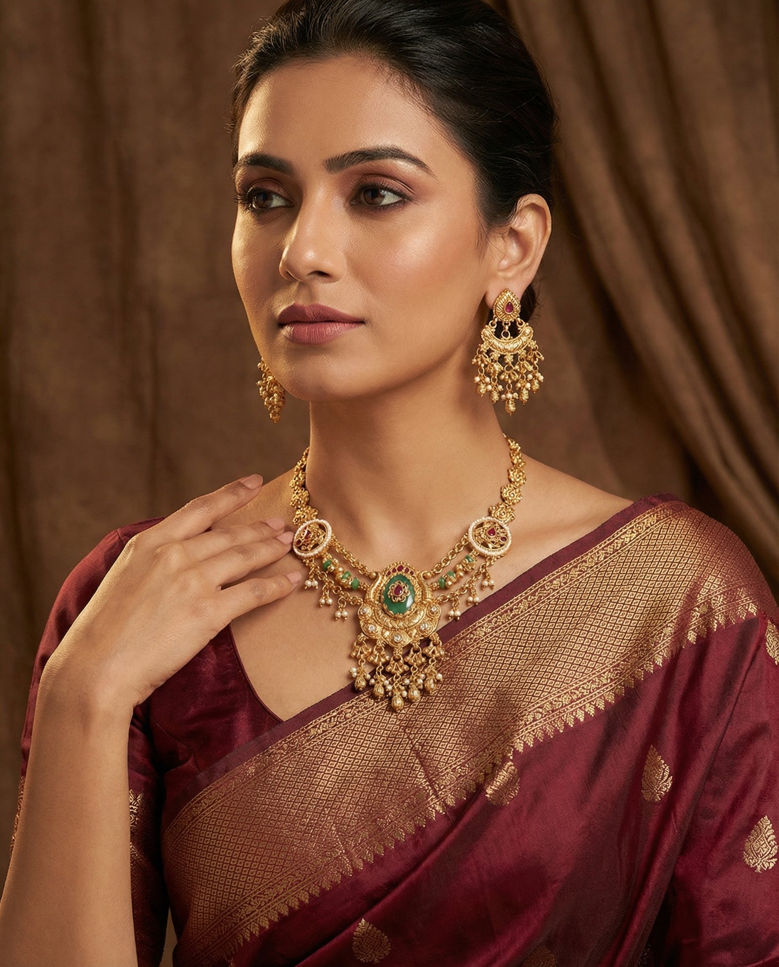 ₹1,749.00Current price is: ₹1,749.00.Royal Temple-Inspired Antique Gold Bridal Necklace Set