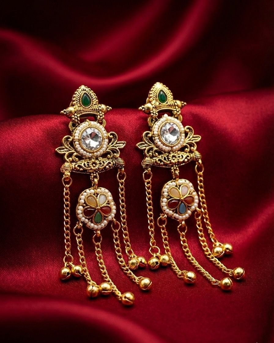 These exquisite antique gold–finish earrings showcase classic Kundan-inspired craftsmanship with intricate detailing and rich stone accents. Featuring a central crystal surrounded by delicate pearl work, highlighted with green and red enamel touches, the earrings are finished with elegant chain drops and tiny gold beads for graceful movement. Perfect for adding regal charm to traditional and festive outfits.