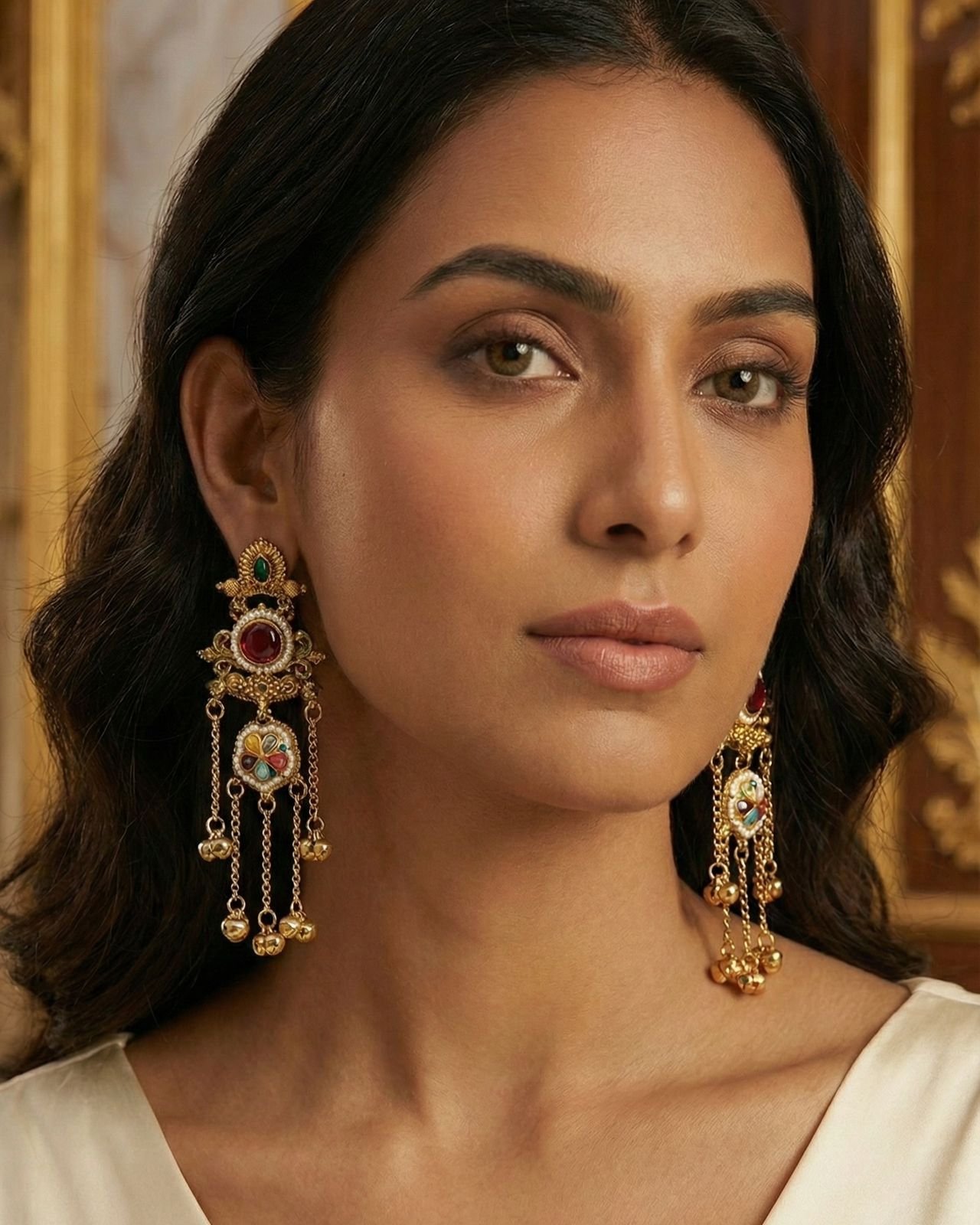 Antique gold–finish earrings with Kundan-inspired design