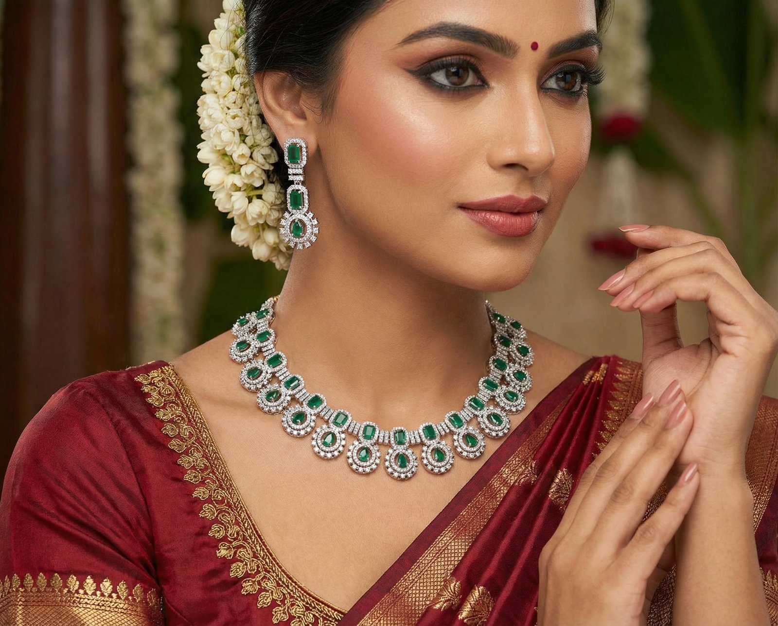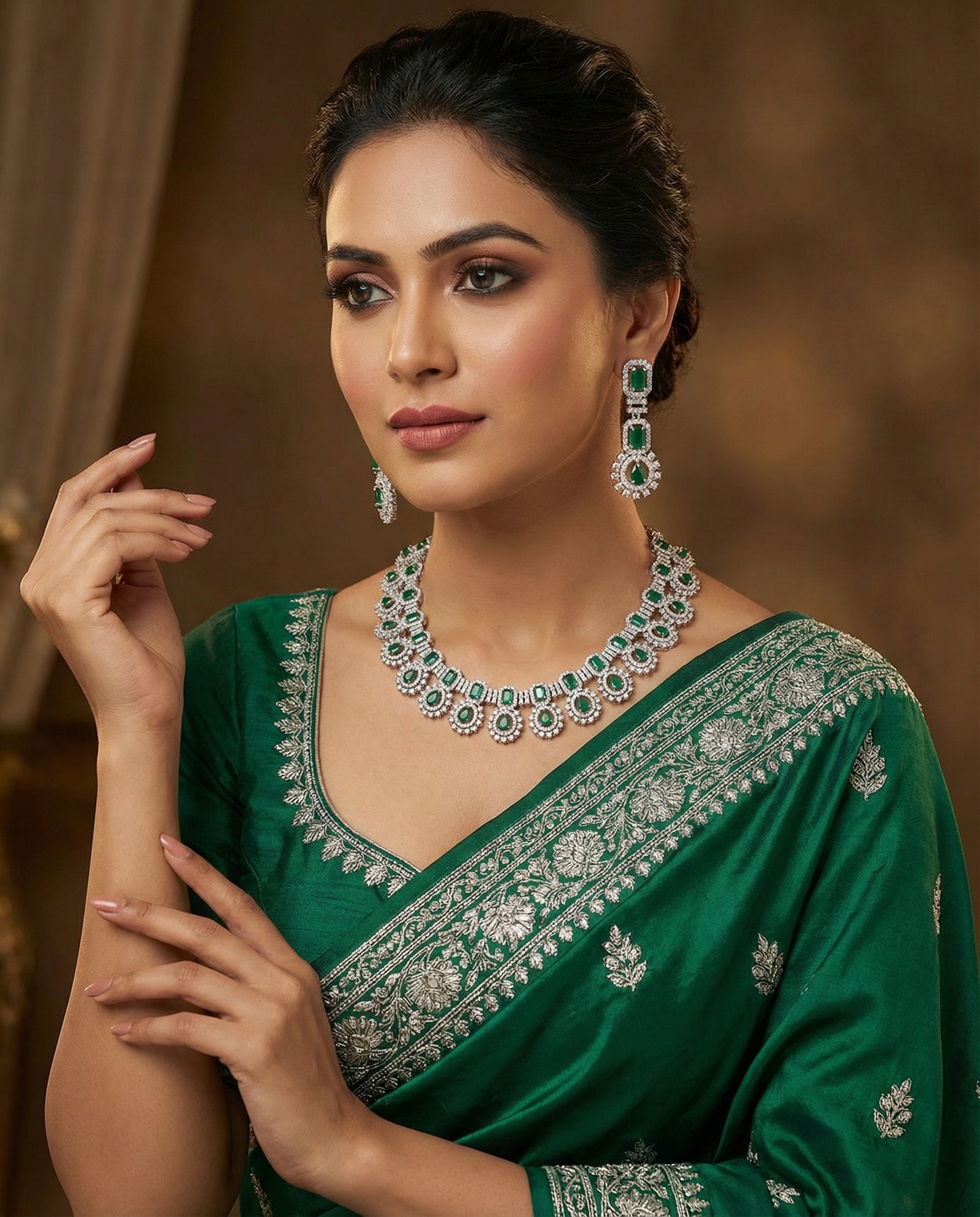 This luxurious statement necklace set features radiant emerald-green crystals framed by brilliant white stones, creating a striking contrast and timeless elegance. The necklace showcases a rhythmic pattern of oval and rectangular stones arranged in a graceful curve, while the matching drop earrings mirror the same refined detailing. Designed to make a bold yet elegant statement, this set is perfect for weddings, receptions, festive celebrations, and grand evening events.
