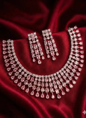 Make a majestic statement with this royal antique gold–finish bridal necklace set, beautifully crafted with traditional Kundan-style detailing. The bold choker-style necklace features intricate filigree work, red and green stone embellishments, and layered dangling motifs that exude regal elegance. Paired with matching statement earrings, this set is perfect for brides and grand festive occasions.