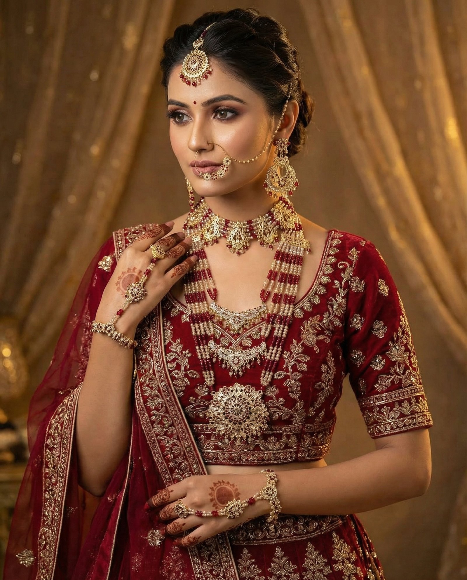 Enhance your traditional look with this elegant Royal Rani Multilayer Bridal Necklace Set, designed with multiple strands of ruby-red and crystal beads paired with finely crafted gold-tone motifs. The centerpiece pendant and matching earrings reflect rich Indian heritage craftsmanship. This complete jewellery set is perfect for brides and festive occasions, adding grace, charm, and royal elegance to your attire.