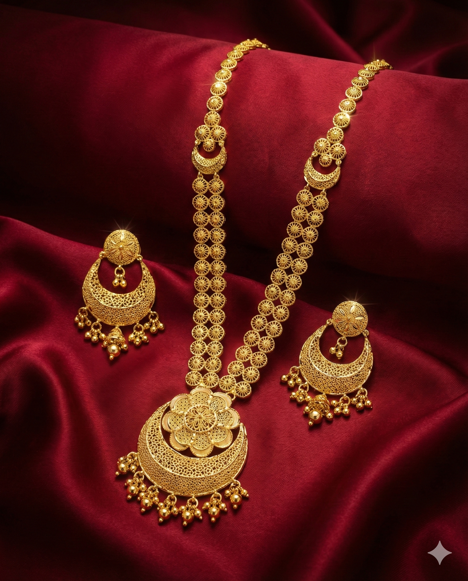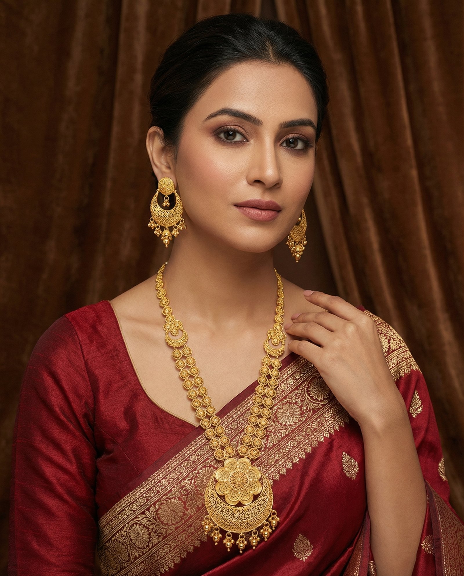 Traditional Gold-Finish Long Necklace Set with Matching Jhumka Earrings
