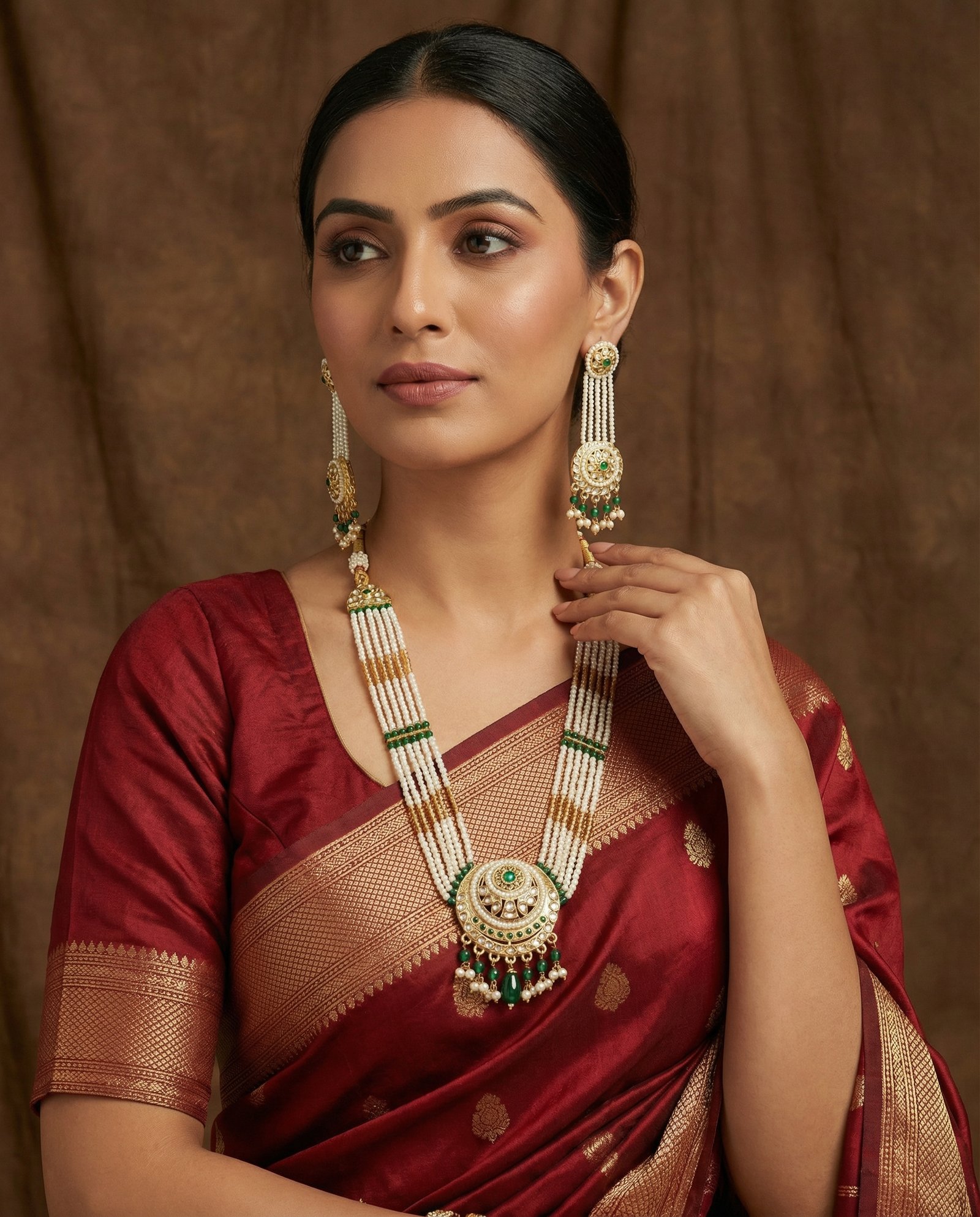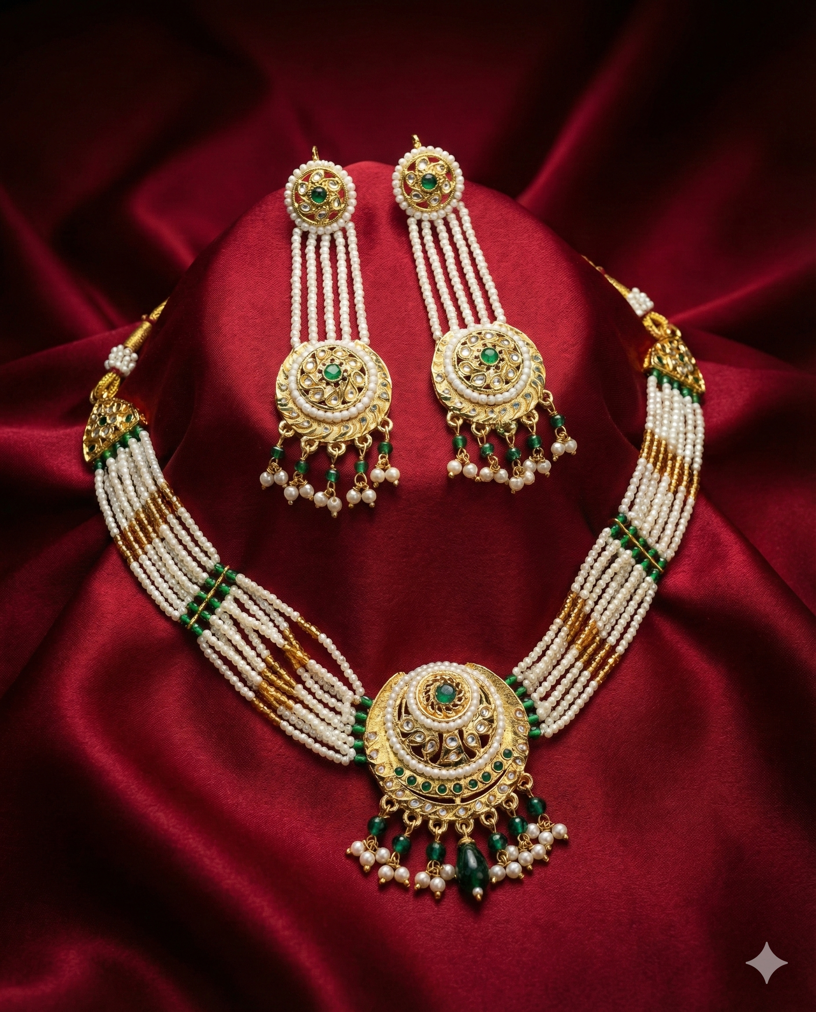 This elegant necklace set features multiple strands of lustrous pearls beautifully accented with green beads and a richly detailed Kundan-style pendant. The circular pendant is adorned with intricate gold-tone craftsmanship and delicate dangling pearls, creating a regal yet graceful look. Paired with matching long drop earrings, this set is perfect for weddings, festive celebrations, and traditional occasions.